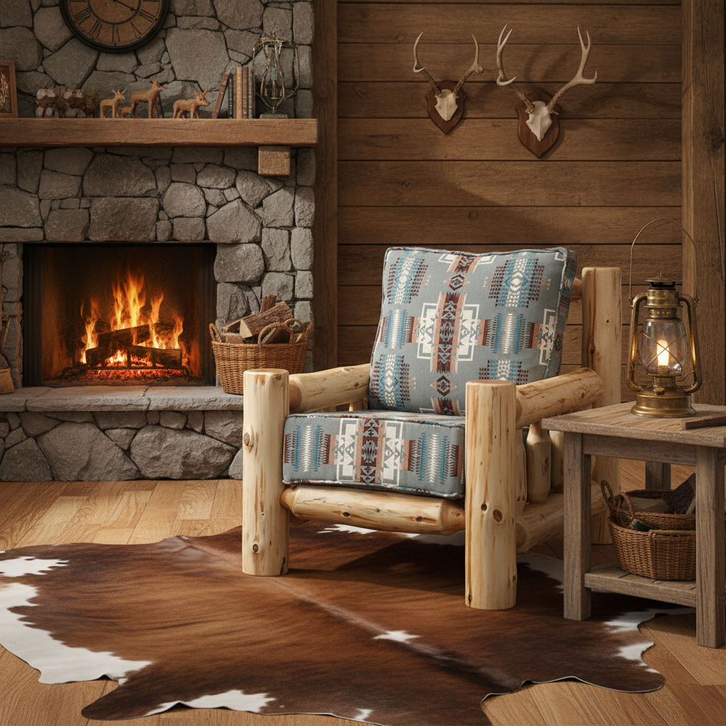 This cedar log lounge chair is also available in Standard Fabric, Upgrade Fabric, Premium Fabric, and Standard Leather.