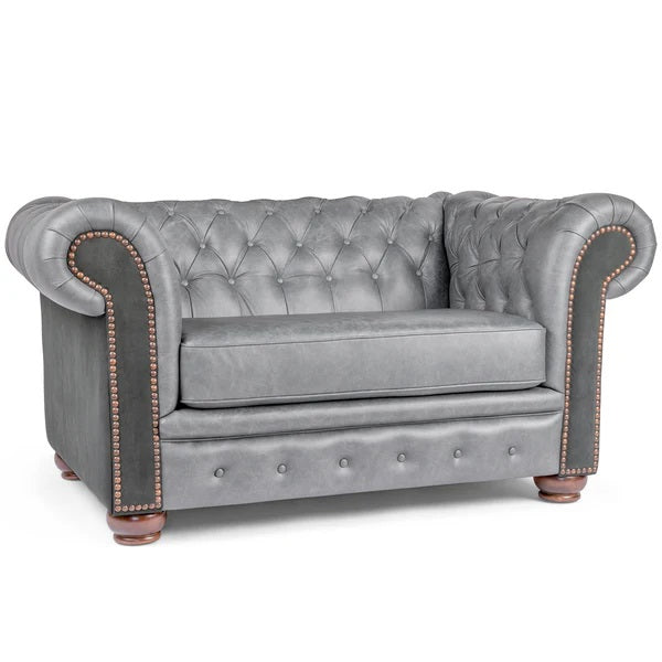 The Heritage Ranch Winchester Saloon Grey Leather Oversized Chair brings classic chesterfield styling to a single-seat silhouette that works anywhere a strong accent piece is needed. Upholstered in smooth saloon grey leather, this chair features a button-tufted back, rolled arms, and a well-proportioned frame that feels both substantial and inviting. Contrasting dark gray leather is featured on the arm posts, sides and back.
