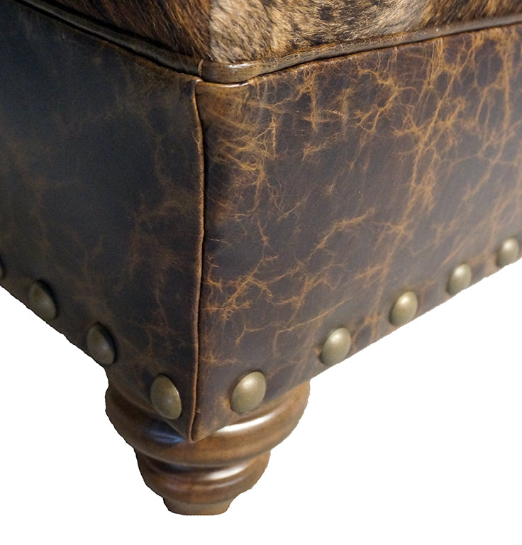 Great oversized 4-foot square ottoman works well as an ottoman or coffee table in front of a sofa or sectional sofa. The Gringos ottoman is upholstered on the top and top band with medium brindle Brazilian cowhide and full-grain Buffalo leather on the lower band. This popular ottoman is finished with antique brass nail heads. Made in the USA.