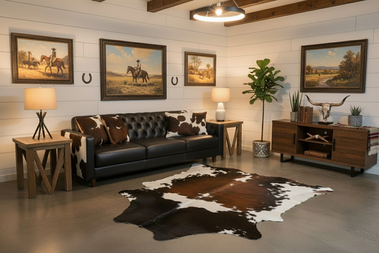 This stunning tri-color Columbian cowhide rug combines natural beauty with refined elegance, making it an exceptional choice for discerning interiors. Featuring rich black accents alongside warm, earthy tones, each hide is uniquely patterned by nature, ensuring no two rugs are identical. The extra-large dimensions provide generous coverage, perfect for anchoring living spaces, bedrooms, or sophisticated home offices. Authentic cowhide delivers exceptional durability and develops character with age, while its natural texture adds warmth and dimension to contemporary or traditional décor. A timeless investment piece that elevates any room with understated luxury and authentic Western charm.