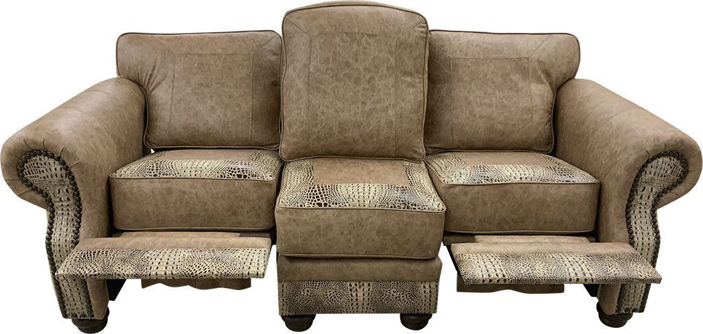 Spend quality time with family and friends in superior comfort on this beautiful top grain camel leather double recliner sofa. It is accented with embossed gator leather details, gorgeous antique bronze nailheads and finished with exotic Brazilian light hair on cowhide leather. This stand out sofa is perfect for any rustic or western lodge cabin. Reclining and relaxing with family and friends is never this fashionable or this easy. Look for other matching pieces in our Pinto Cowhide collection for a complete look. Made in the USA.