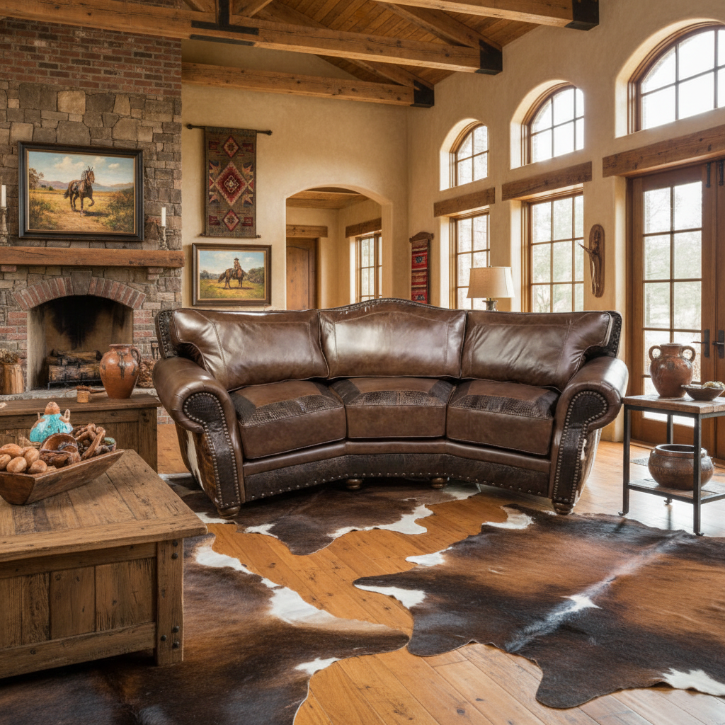 The Arroyo Conversational Western Sofa returns in a rich Jupiter Truffle leather, expertly enhanced with vintage gator embossing and luxurious caramel brindle Brazilian hides that wrap the outarms and outback, creating a truly captivating look. Detailed with antique bronze nailheads, this sofa blends classic western style with refined craftsmanship. Beyond its striking design, the sofa offers exceptional durability and comfort thanks to its faux down wrap seating and plush blown-back cushions. Perfect for family gatherings or relaxing moments, the Arroyo Conversational Western Sofa transforms any living space into a warm, inviting retreat that celebrates both style and comfort.Other matching pieces available. Shop our collection of Western Curved Sectional Sofas. Made in the USA.