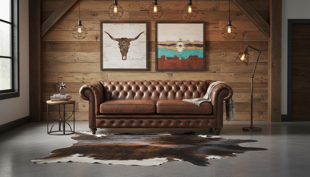 Living room with leather sofa, wooden walls, and decorative elements.