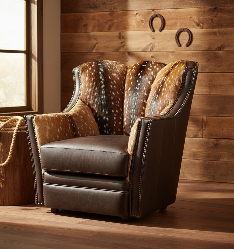The Mesa Grande Axis Swivel Glider blends rustic charm with refined craftsmanship. The inside seat back showcases genuine axis hide, adding natural warmth and texture, while the rest of the chair is upholstered in dark distressed leather for a rich, timeless look. A classic nailhead trim outlines the silhouette, giving it that handcrafted Western finish. Comfortable, stylish, and full of character, this swivel glider is made for those who appreciate the beauty of authentic materials and enduring design. With its smooth swivel-glider mechanism and deep hues, this piece is made to anchor a ranch-style room, a rustic retreat—or any space that appreciates timeless Western design. The natural character of the leather gives a warm, rugged feel that’s perfect for ranch-style homes, rustic cabins, or traditional Western interiors. Ask us about custom options!