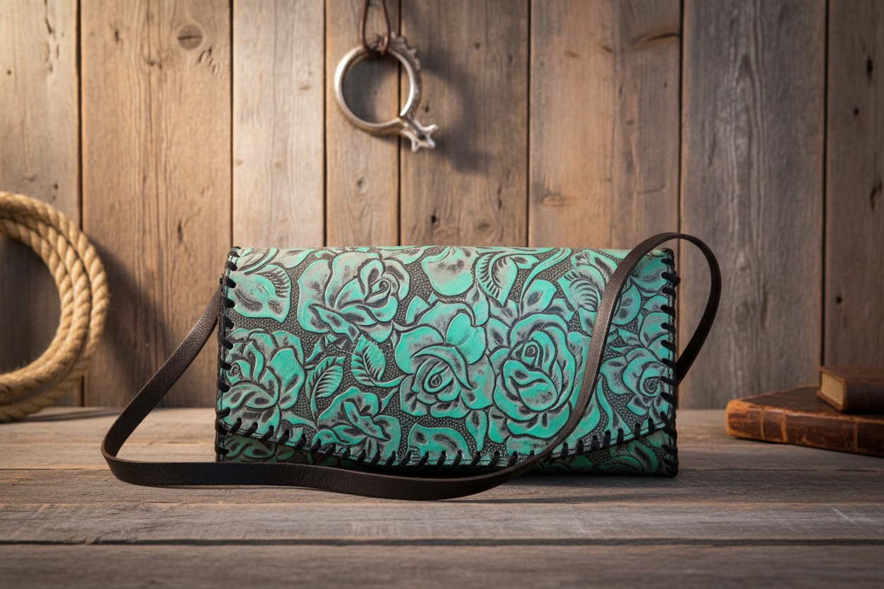 Add a pop of color to your outfit with the Juan Antonio Rosal Turquoise Leather Clutch! The embossed floral pattern and black leather trim add a touch of elegance, while the removable strap provides versatility. Secure your belongings with the magnetic snap closure. Also available in other colors. Due to lighting used during photography, actual finishes may vary from imagery. Click Here for additional Juan Antonio bag and wallet options.