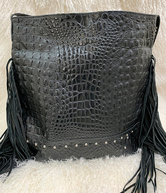 Juan Antonio shoulder bag has beautiful black and white brindle hair on hide on front by with generous black leather fringe accents on the sides. The back has a lovely croco embossing along with antique silver tone stud embellishments on the strap, front and back of bag. Due to lighting used during photography, actual finishes may vary from imagery. Click Here for additional Juan Antonio bag and wallet options.