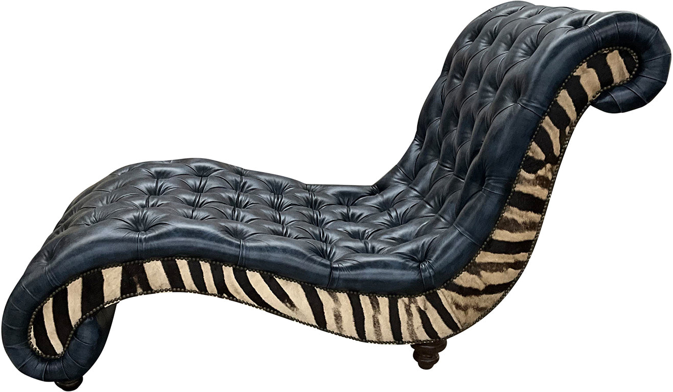 The Zanzibar Chaise is an exotic fusion of elegance and adventure. Hand-tufted in luxurious deep black leather, its graceful silhouette is both striking and comfortable. The dramatic curves invite relaxation, while the bold zebra hide accents along the sides add a distinctive, safari-inspired flair. Nailhead trim completes the look with refined detail, balancing western craftsmanship with global influence. Perfect for a statement piece in a great room, study, or master suite, the Zanzibar Chaise embodies luxury lounging with a wild edge. Browse our Western Chaise collection to discover more statement pieces that bring rustic luxury and refined comfort to your home. Made in USA.