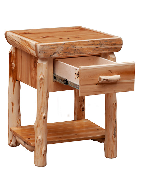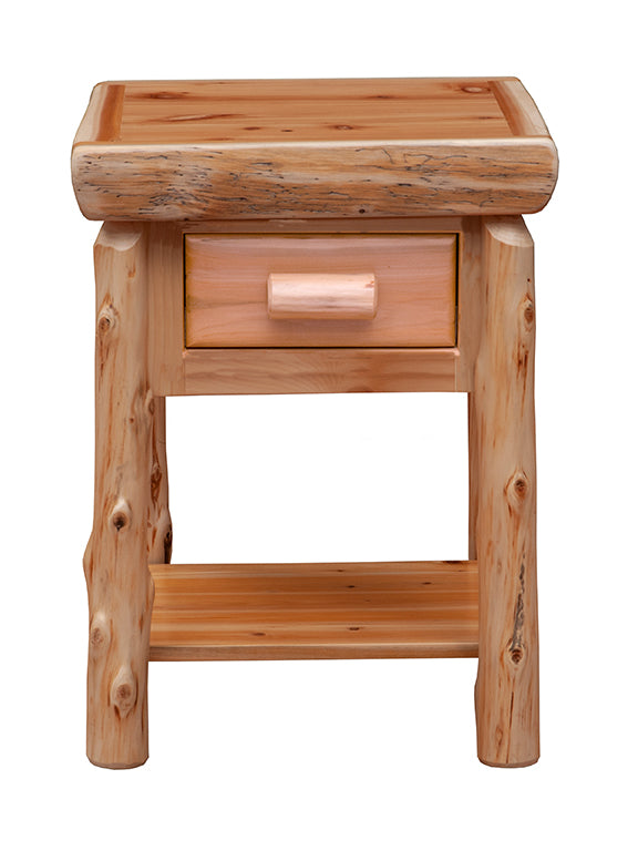 One Drawer Nightstand with Shelf in Natural Cedar, Coffe, Vintage Cedar, or Weathered stain. Handcrafted from responsibly-sourced Northern White Cedar. Logs are hand-peeled to accentuate the wood's natural character and beauty. Features soft-close, full-extension ball bearing glides rated to 100 pounds. High-quality, dovetailed drawers. Stands 27-inches tall. Cedar drawer pull maintains a cohesive look.