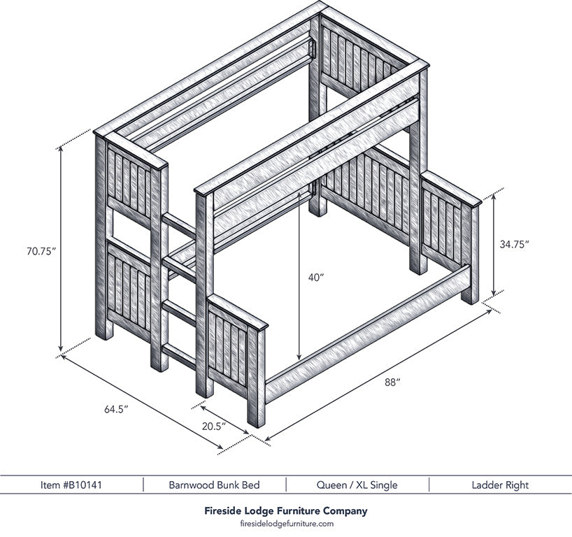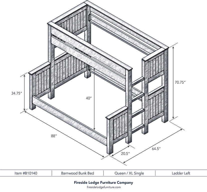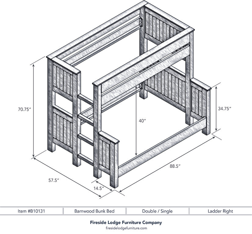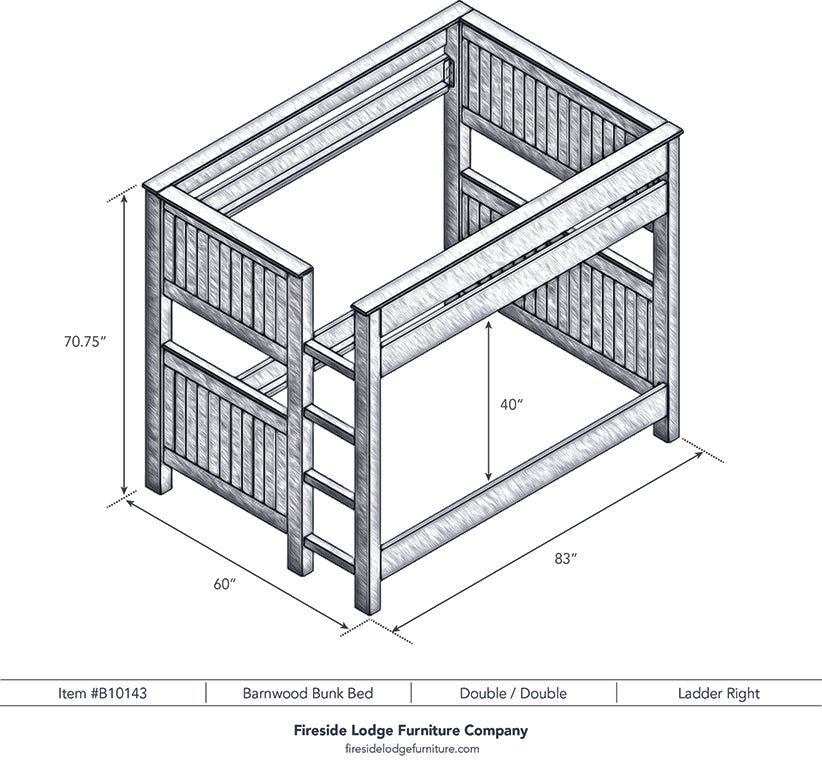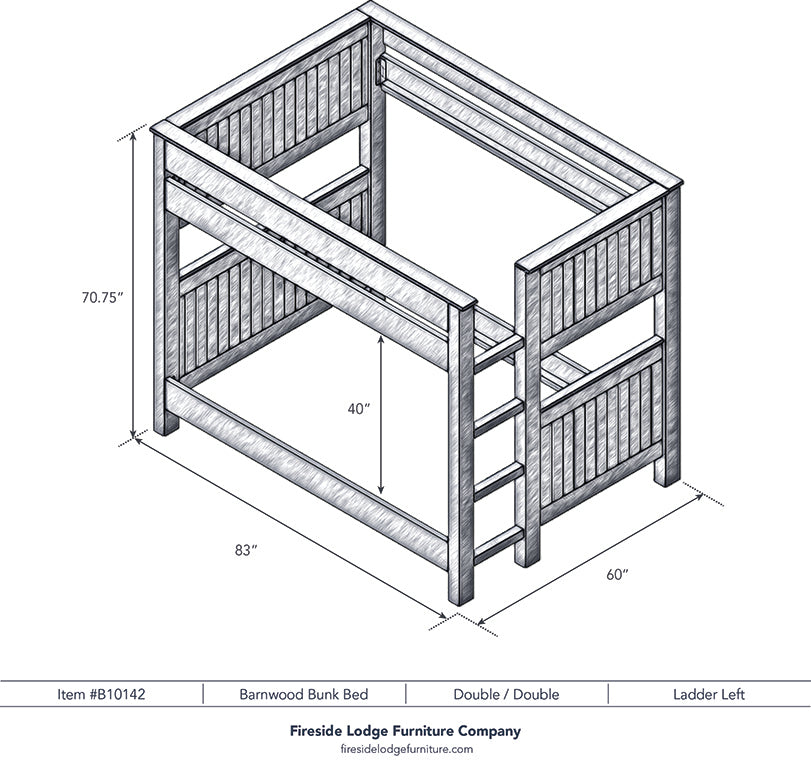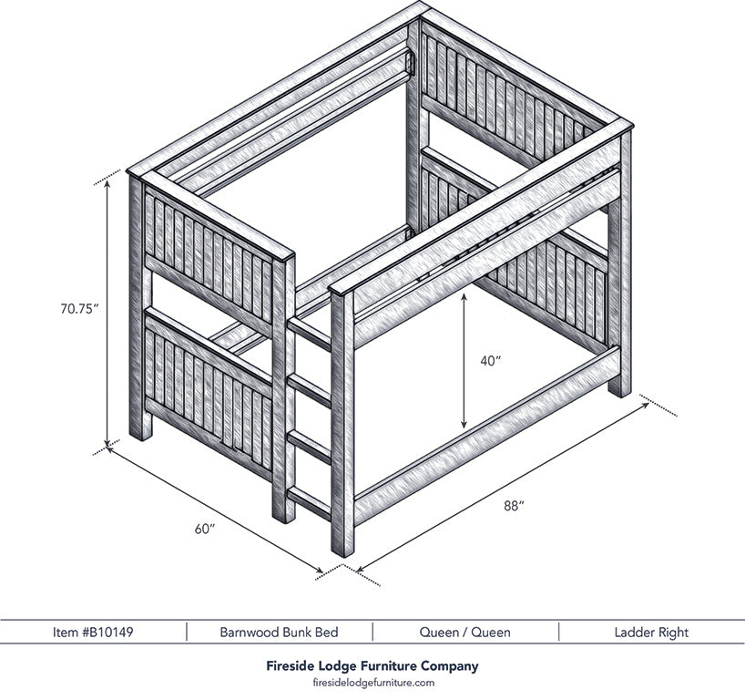 Whether you are decorating a Western bedroom or chic cabin, these rustic barnwood bunkbeds are an outstanding choice. Individually hand crafted using reclaimed Red Oak planks from 1800s tobacco barns gives the furniture unique character. A clear coat catalyzed lacquer finish is extra durable and retains the natural look of the wood. Full length hardwood rails offer a sturdy construction. Beds comes with center supports, slats and hardware kit. Please specify if you would like the placement of the built-in footboard ladder on the right or left hand side (shown on the left). For safety, a standard eight inch thick mattress on top bunk is recommended. There is 43 inches from top of lower bed rail slats to the bottom of the upper bunk bed rail. Limited Lifetime Warranty against manufacturer defects. Individually handcrafted. Made in the USA.