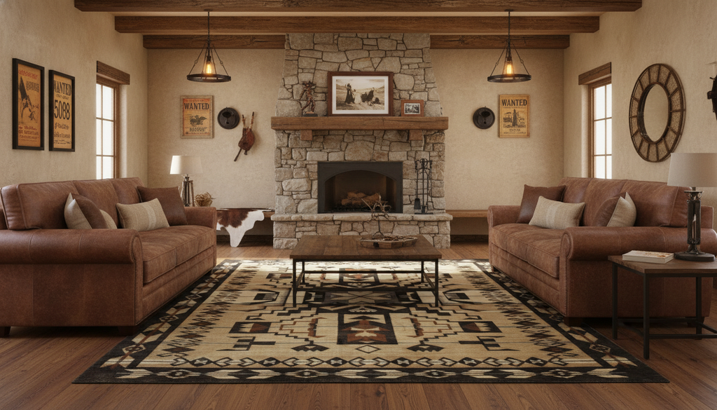 Rug with geometric pattern featuring triangles and diamonds on a beige background