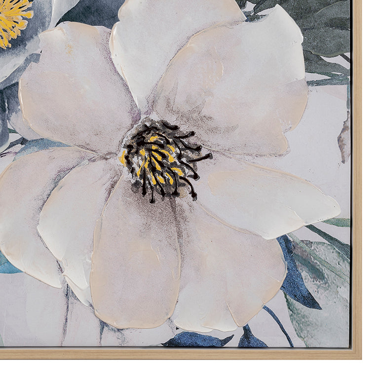 The Flower Power wood frame canvas painting showcases elegant flowers in a bunch with hues of white, blue, and yellow. This piece is 70-percent hand painted and measures 39.4-inches square. This lovely artwork showcases a transitional style that will blend within almost any decor. Imported.
