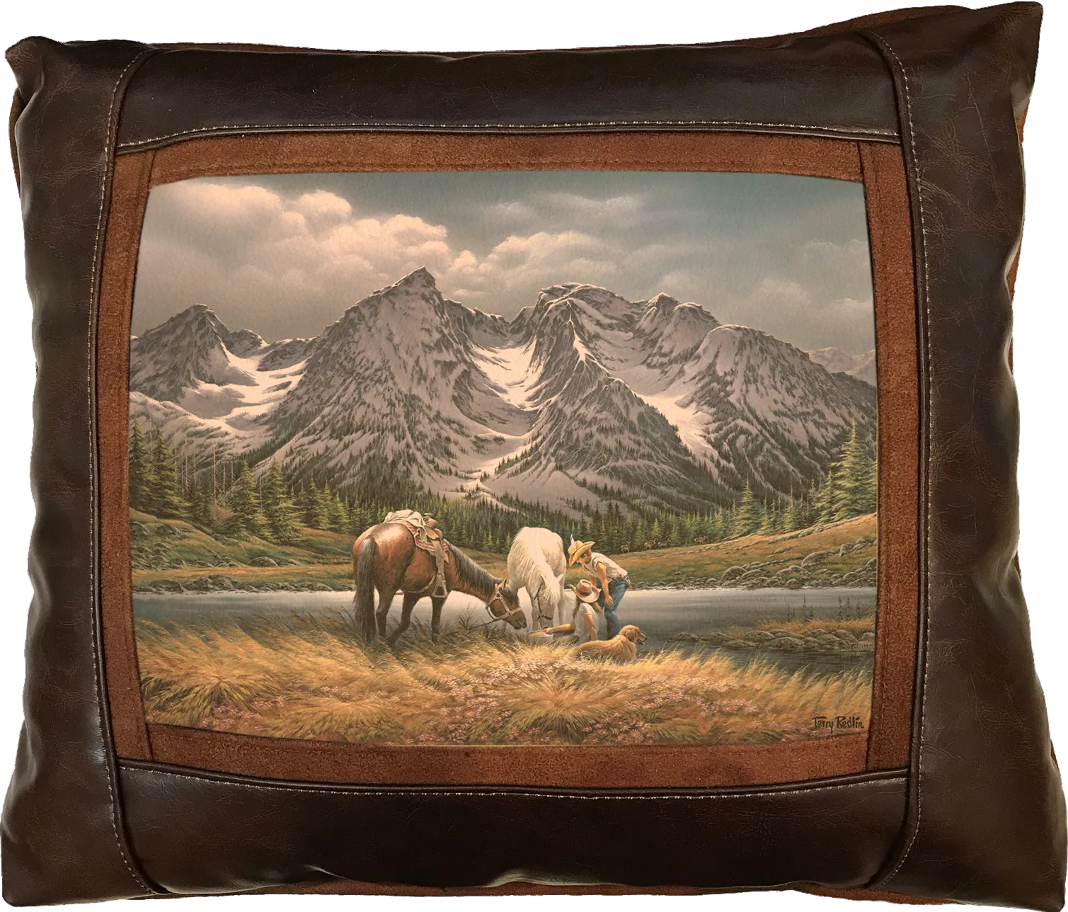 Sweetwater pillows have found their place in lodges, hotels, national parks, and countless homes throughout the country. This widespread presence speaks to the quality and appeal of their pillows, as they effortlessly enhance various settings. When it comes to our Frame Western Pillows, we employ a distinctive printing technique on chamois colored leather, imparting the images with a warm, aged appearance. The frame surrounding the image, along with the welt and back of the pillows, is meticulously crafted using Faux Suede, ensuring both durability and elegance. As for the front border, you have the option to choose between Faux Leather and Genuine Leather, allowing you to personalize your pillow according to your preferences. Please do not place pillow in direct sunlight to prevent leather from fading.