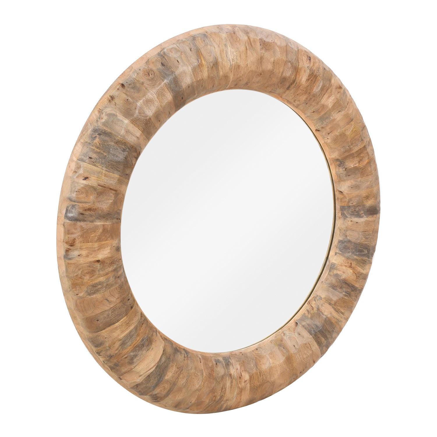 The Gibson Transitional Round Wall Mirror is all about natural character and solid craftsmanship. Framed in hand-carved wood with a warm natural finish, each section highlights the unique grain patterns, knots, and tonal variation that make real wood so timeless.