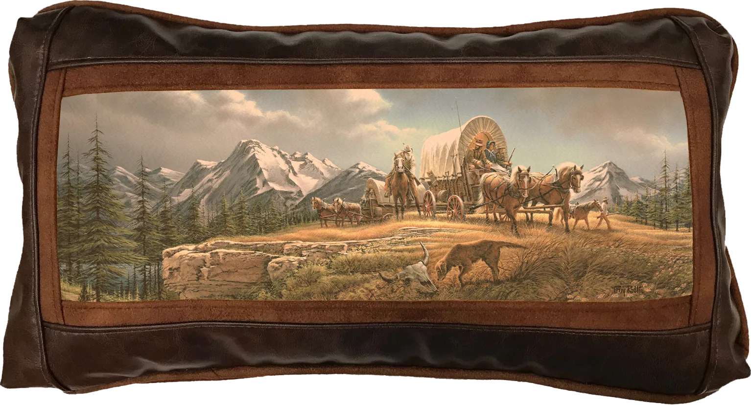 Sweetwater pillows have found their place in lodges, hotels, national parks, and countless homes throughout the country. This widespread presence speaks to the quality and appeal of their pillows, as they effortlessly enhance various settings. When it comes to our Frame Western Pillows, we employ a distinctive printing technique on chamois colored leather, imparting the images with a warm, aged appearance. The frame surrounding the image, along with the welt and back of the pillows, is meticulously crafted using Faux Suede, ensuring both durability and elegance. As for the front border, you have the option to choose between Faux Leather and Genuine Leather, allowing you to personalize your pillow according to your preferences. Please do not place pillow in direct sunlight to prevent leather from fading.