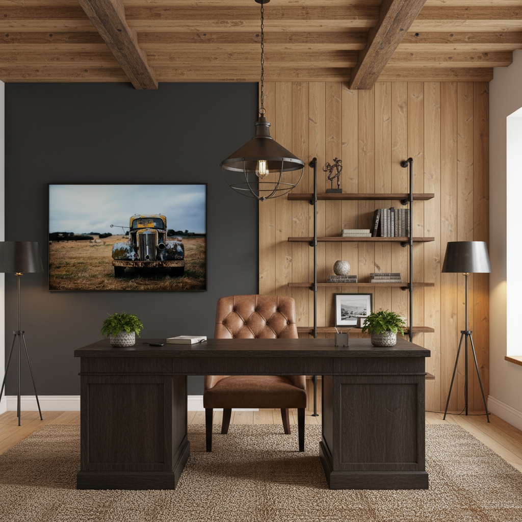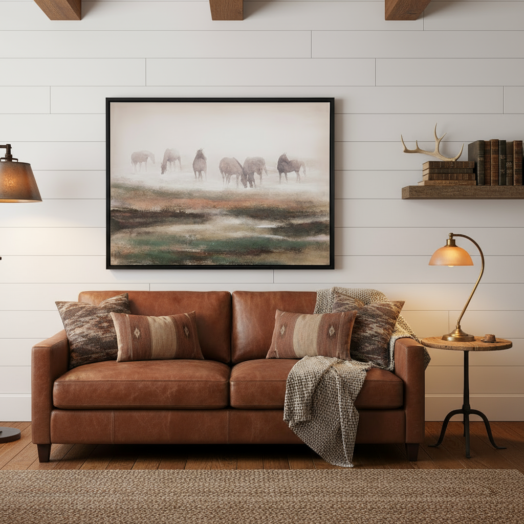 Brown leather sofa in a rustic room with wooden walls and decor.