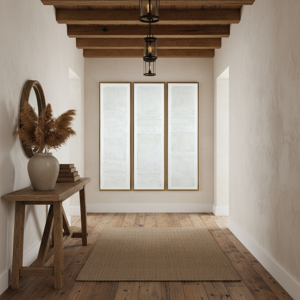 Knitted throw blankets and pillow in white and gray on a wooden floor with a white wall background