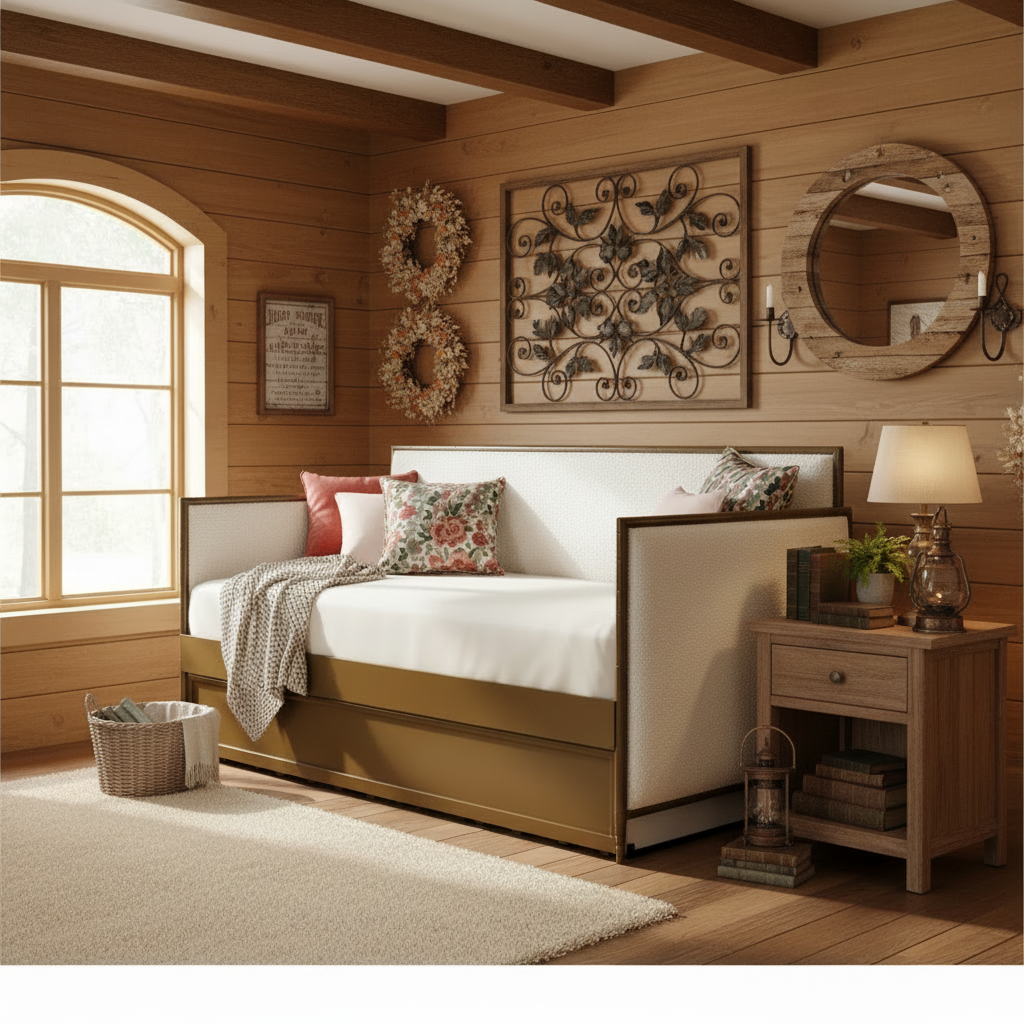 Metal Profile with Metal Facing Non Pop-Up Roll Out Unit. The Royce daybed challenges ordinary, boring daybed design. A posh, debonair statement piece with an attitude, the Royce boasts clean, crisp lines and square sides carefully upholstered with the fabric option of your choice. The real win, though, is practicality. The lower section pulls out smoothly to create an additional sleeping space, making this daybed ideal for overnight guests, kids’ rooms, or anywhere you want flexibility without sacrificing style. When tucked away, it keeps the room open and uncluttered. When pulled out, it turns into a smart, comfortable solution for extra sleepers—no air mattresses, no fuss. Made in the USA by Wesley Allen, the leading manufacturer and designer of expressive and eclectic iron furniture. Due to lighting used during photography, actual finishes may vary from imagery.