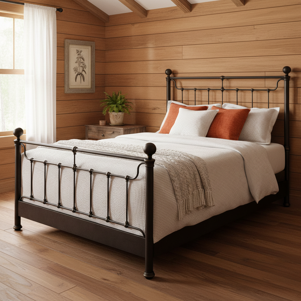 The nickel colored iron with antiqued accents is a perfect contrast to our dark wood furniture. It also serves as a piece of artwork that complements the paintings surrounding the bed.