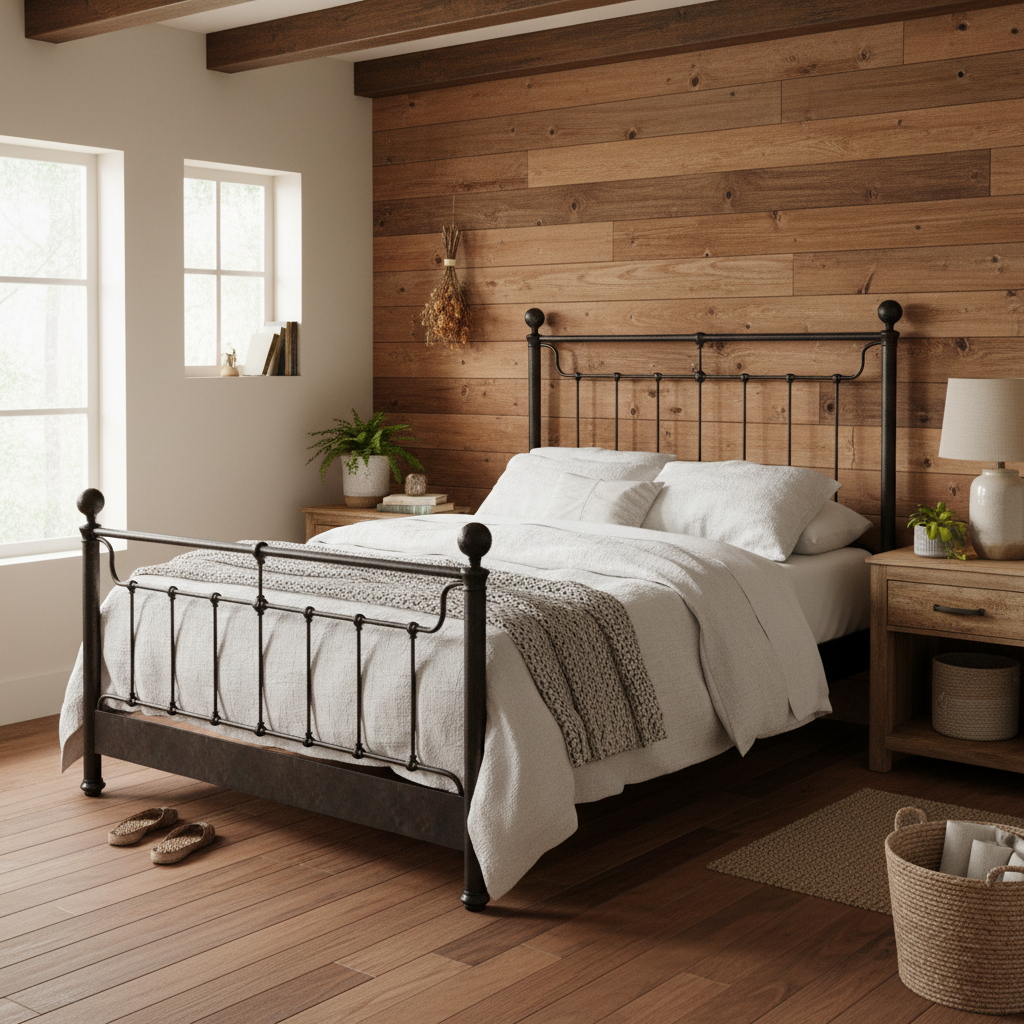 The Tucker iron bed offers a classic charm, while also providing enough versatility to fit an updated bedroom design. Strong bars are accented by delicate inner bars, with a mix of straight lines and curved edges. This design creates an intriguing look with open columns that show off bedding and expertly frame the sturdy bed. This bed comes with wooden roll-top slats. A box spring base is not required. Made in the USA by Wesley Allen, the leading manufacturer and designer of expressive and eclectic iron furniture.