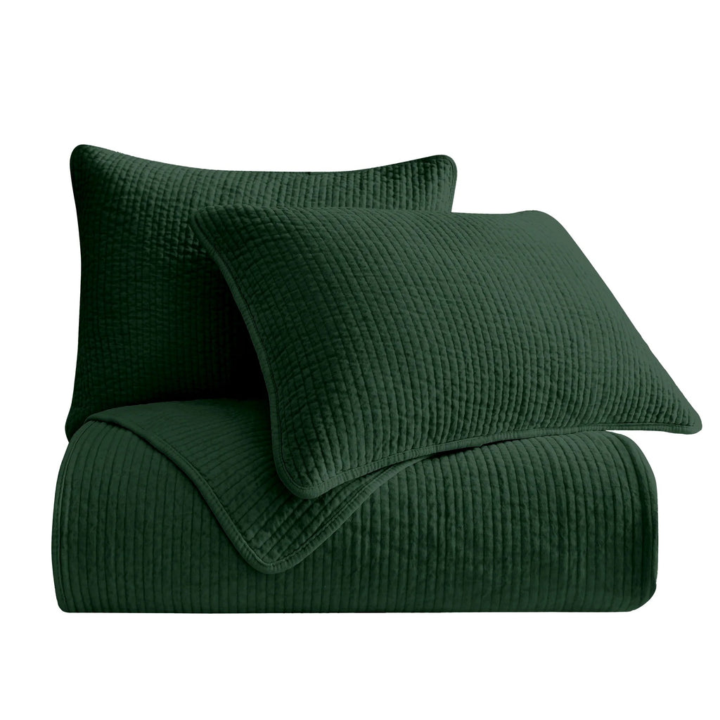Stonewashed Emerald Cotton Velvet Quilt Set, featuring soft cotton velvet fabric with channel quilting, displayed on a bed with matching pillow shams.
