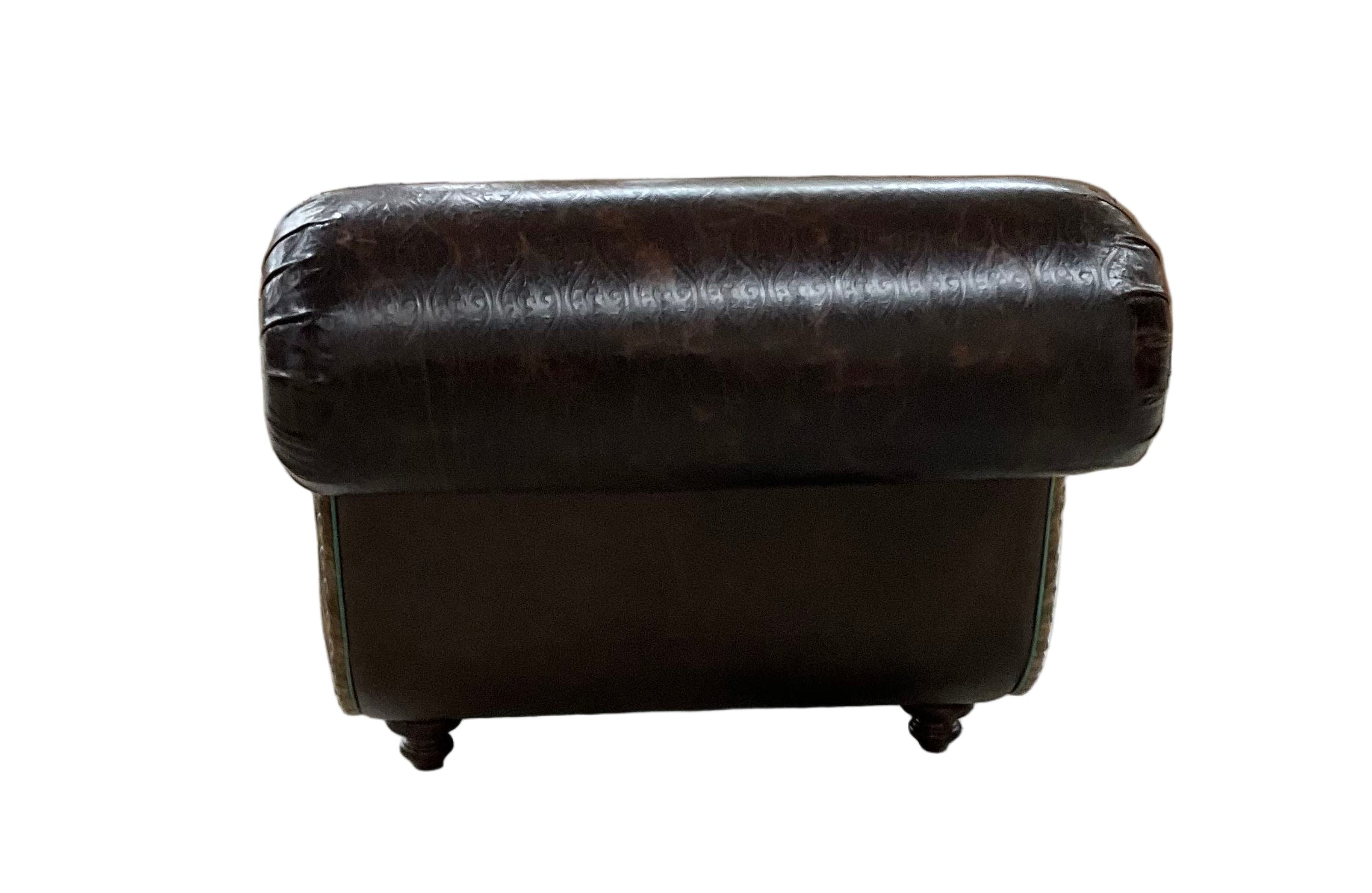 The Turquoise Trail Chaise Lounge combines luxurious comfort and striking style, featuring buttery soft turquoise leather beautifully accented with subtly embossed dark brown leather at the head and bottom end. This elegant piece is further enhanced by exotic Brazilian hair-on-hide trim and oversized nail heads that add a bold, refined touch. Perfect for relaxing or making a statement, it invites you to unwind in unmatched softness while showcasing unique craftsmanship. For added support and coordinated style, the matching lumbar hair-on-hide pillow is available separately, completing this exquisite lounge experience. Additional custom accent chairs available. Made in the USA.