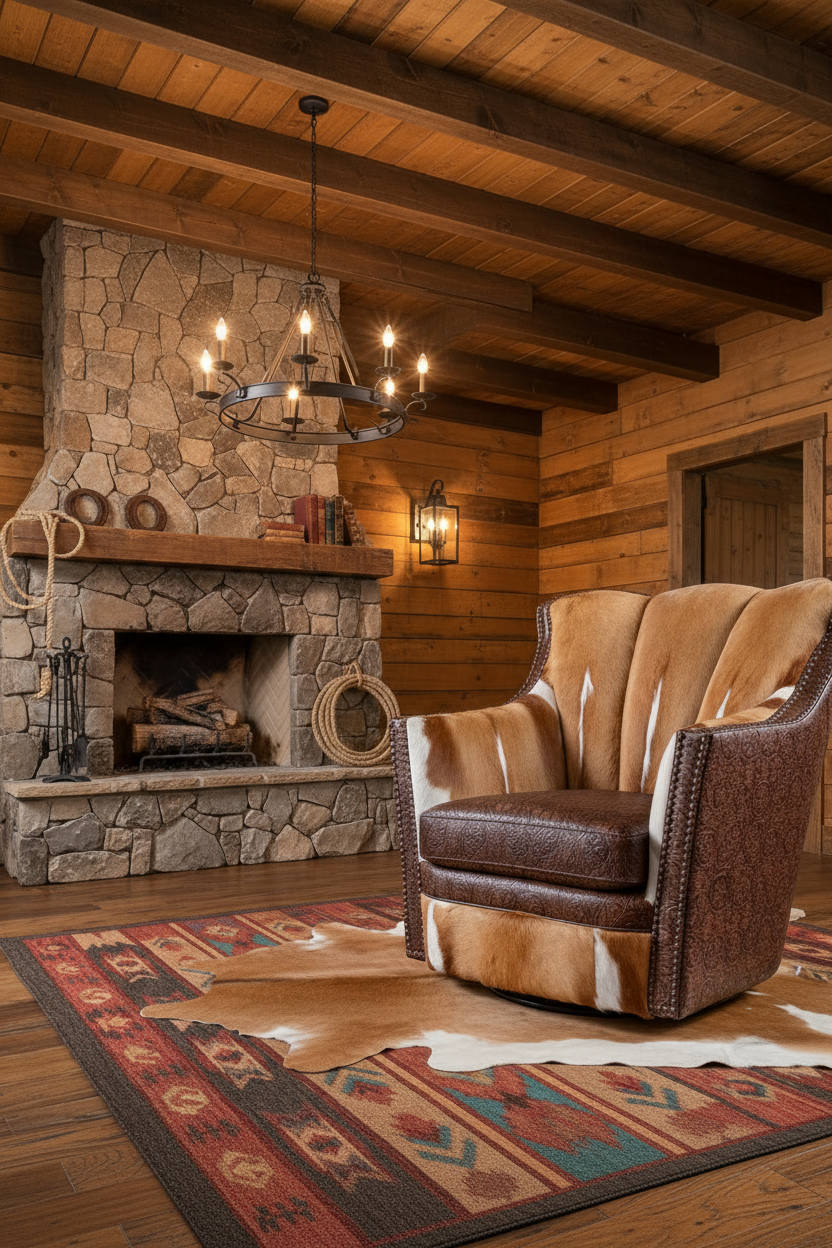- Nailhead trim outlining the arms and frame for a classic Western touch