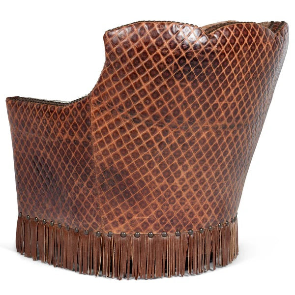 The Heritage Ranch Mesa Grande Palomino Cowhide Swivel Glider Western Chair showcases genuine hair-on-hide lining the inside back and arms, creating a striking contrast against its rich, hand-finished leather upholstery. The exterior features embossed leather panels with a subtle diamond pattern, accented by nailhead trim and hand-cut leather fringe along the base. A smooth swivel and glider motion adds effortless comfort, making this chair as functional as it is refined. Designed as a statement piece, it brings elevated Western style to luxury ranch, lodge, and rustic interiors. Ask us about custom options!