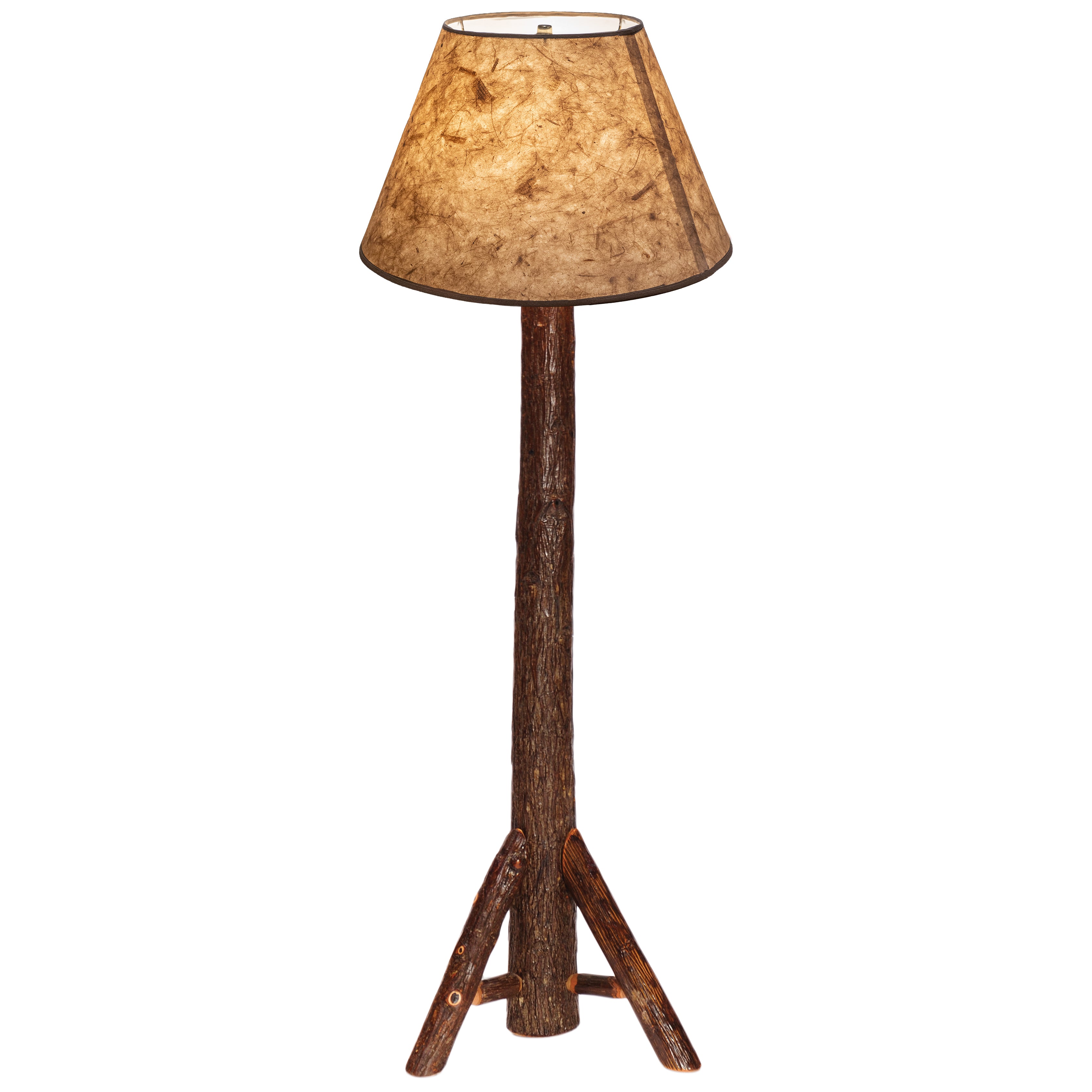 Hickory Floor Lamp - without Lamp Shade in Standard Finish and Natural Hickory stain. Choose between two styles of logs in five stains. Classic (with sanded bark) or Refined (with bark removed). Bark-on hickory logs provide amazing rustic character. Hickory furniture is dense, tough, and durable. Individually handcrafted in the USA. UL Certified with three-way switch. 16" to top of log base.. Lamp shade not included. To order lamp with shade, click here. Clear-coat catalyzed lacquer finish for lasting durability. Limited Lifetime Warranty against manufacturer defects. Explore the full range of the Fireside Lodge Hickory Collection today!