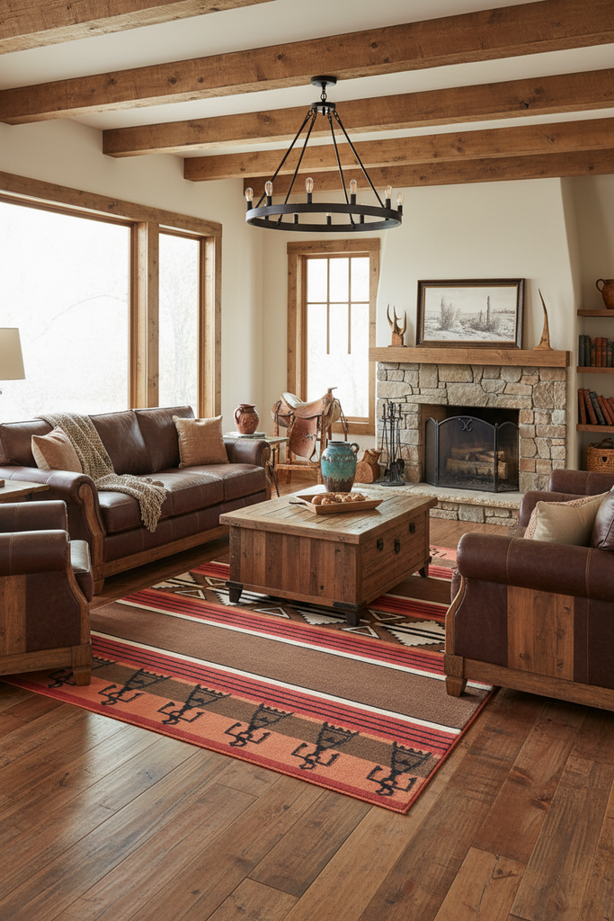 It's time to add some warmth and softness to this western-style living room you've designed. To bring this all home, we're going to now look at some western-themed rugs.