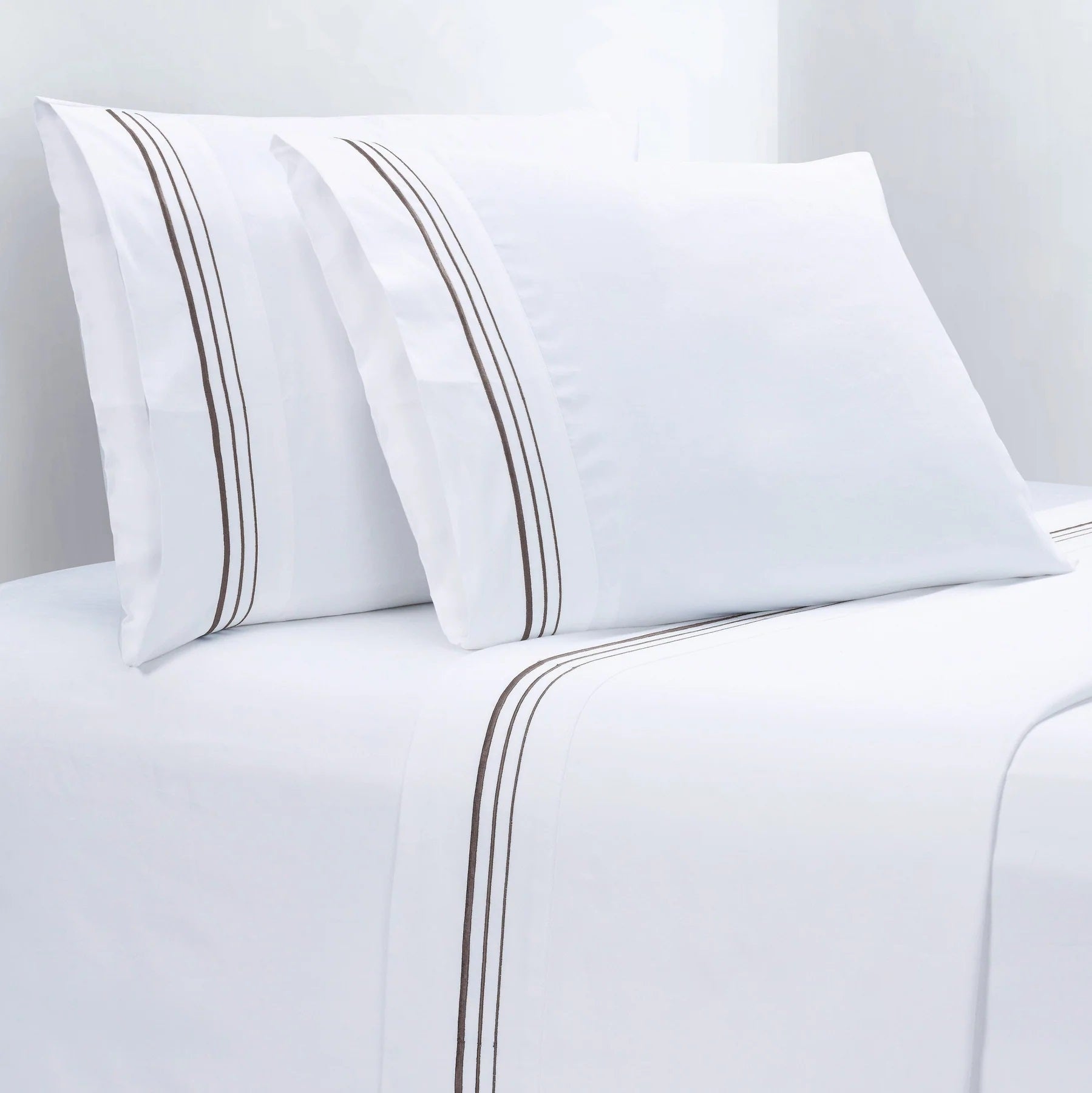 Recall the luxurious look and feel of grand hotel bedding with our Embroidered Border Sheet Set. The pure white 350TC sateen sheeting provides an elegant drape, with crisp embroidered gray line accents for added texture and a refined finish. Each includes flat sheet, fitted sheet and 2 pillow cases (twin has 1 case). Imported.