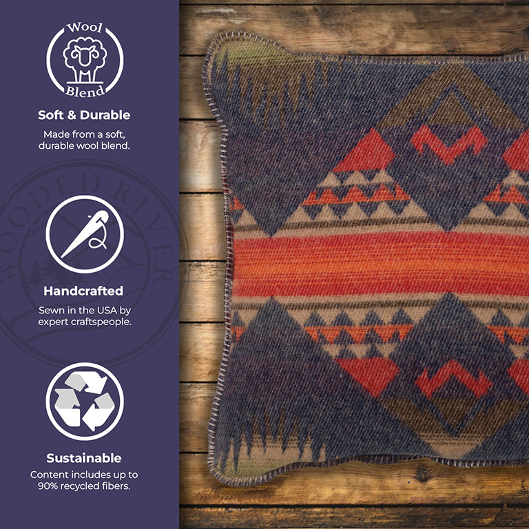 The Socorro pillow blends vibrant reds with neutral shades, creating a lively yet calming Southwestern vibe that instantly brightens any room. Crafted from a washable wool blend made up of 40% acrylic, 30% polyester, 25% new wool, and 5% other fibers, it offers both durability and softness. The decorative blanket stitch around the edges adds a playful, handcrafted touch, making this pillow a delightful accent for your living space. Perfect for mixing and matching with other Southwestern décor, the Socorro pillow brings warmth, color, and personality to your home with ease. Handcrafted by skilled sewers in the USA. All workmanship is guaranteed against manufacturer defects for 30 days from the date of purchase.
