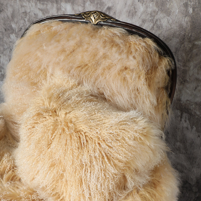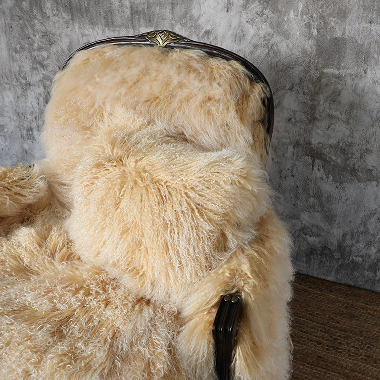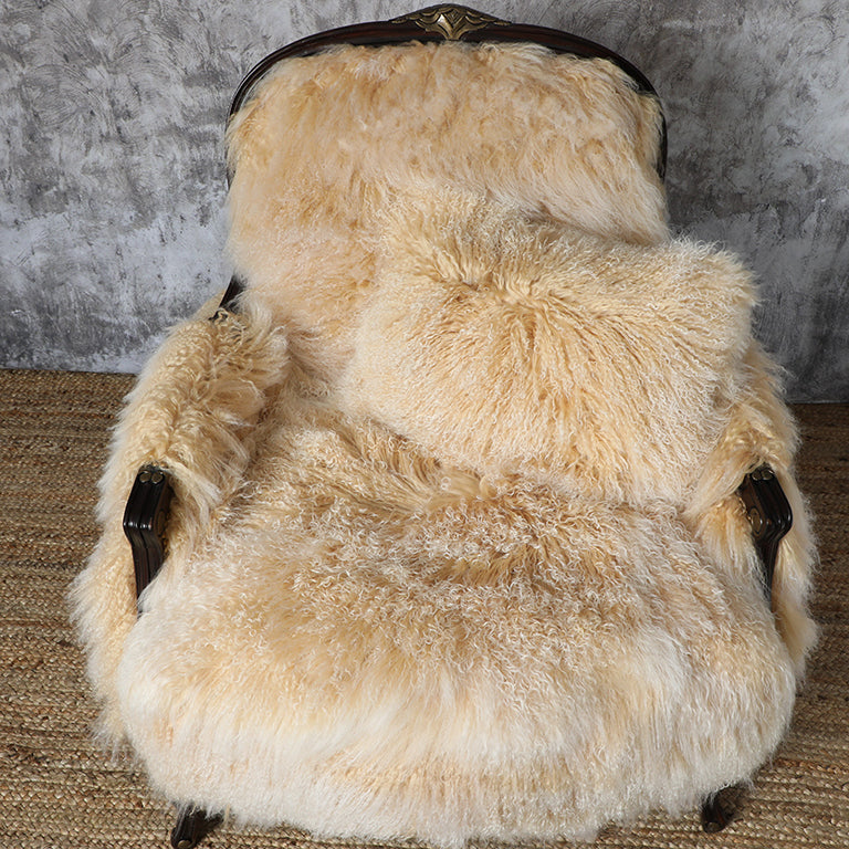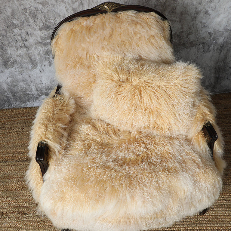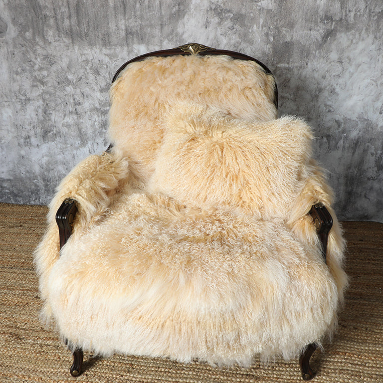 One look says it all. Luxurious champagne sheepskin on bergere style chair with accent pillow.