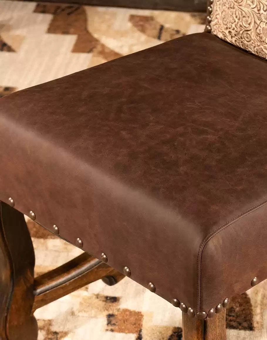 Introducing the mesmerizing Embossed Ivory and Brown Leather Dining Chair, where impeccable craftsmanship meets rustic elegance. With a solid hardwood base as the foundation, this chair showcases exquisite hand-antiqued ivory leather complemented by an antiqued embossed leather accent, resulting in a spellbinding high-end dining chair that stands out in its own right. Designed for the discerning consumer, this piece seamlessly complements its surroundings while infusing your dining space with a new dimension of class and style. Its seemingly simple appearance belies its understated charm, as clever details like the brass studding and decorative embossed leather elevate the Embossed Ivory and Brown Leather Dining Chair from merely durable to brilliantly classic. Proudly Made in the USA.