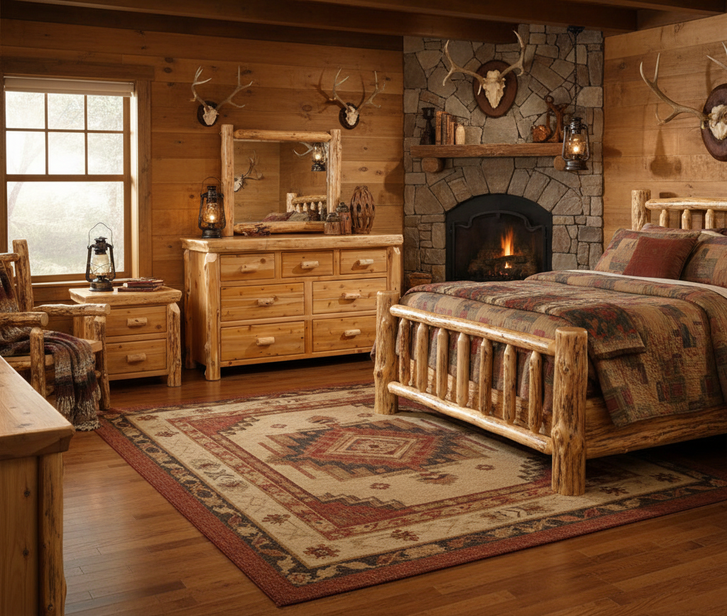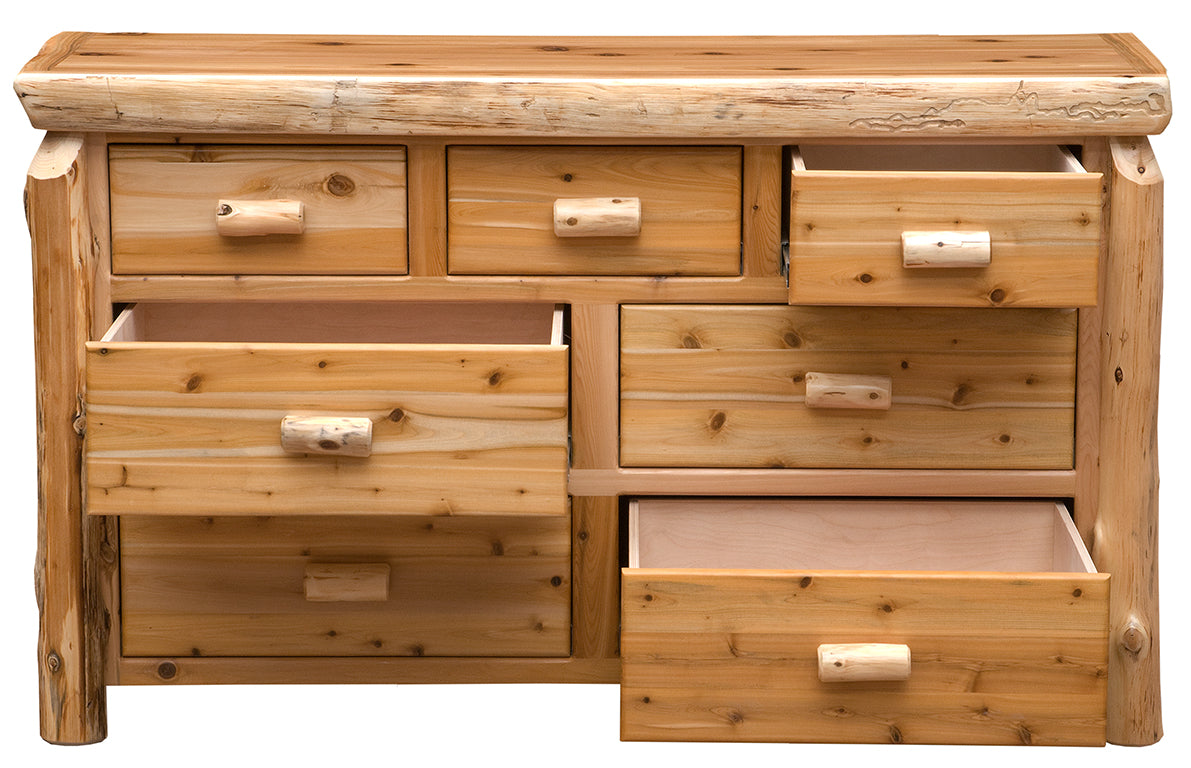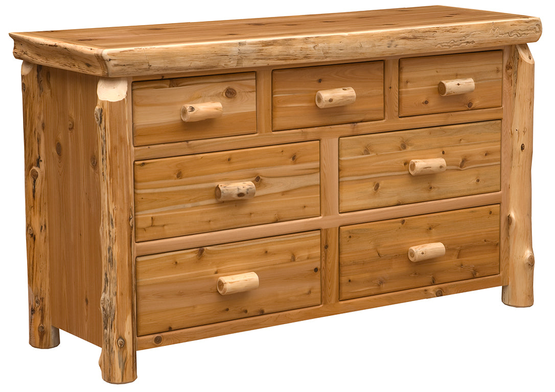 Seven spacious drawers offer generous storage for clothing and everyday essentials, each finished with solid log pulls that highlight its handcrafted construction. Sturdy log legs provide dependable support, while cedar’s natural resistance to wear and moisture makes this dresser well suited for daily use.
