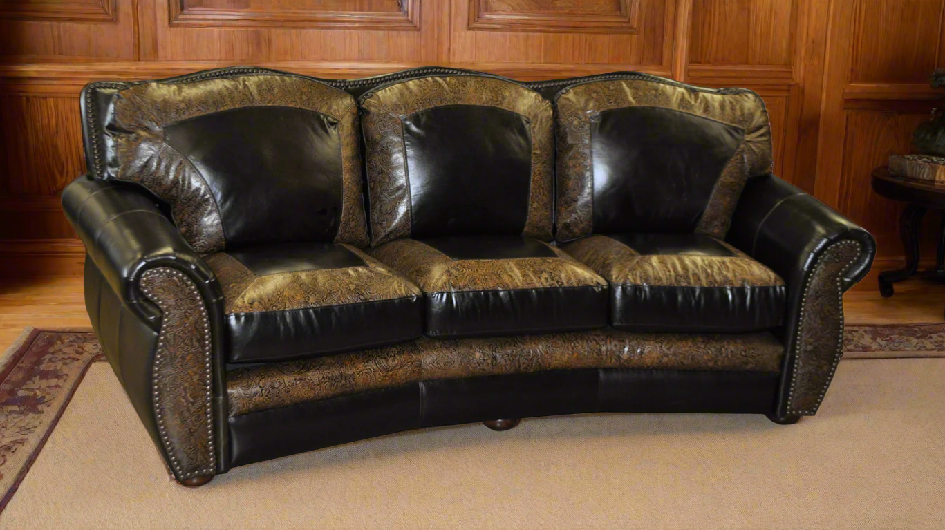 The Heritage Ranch Chaparrel Curved Leather Sofa offers the perfect balance of Western artistry and everyday comfort. Upholstered in a striking combination of premium top-grain leather and tooled leather accents, this three-seat sofa showcases a gently curved design that enhances both style and function. Ask us about custom options!