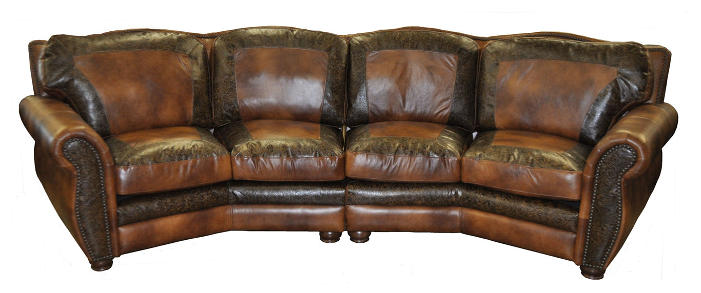 The Heritage Ranch Chaparrel Curved Theater Sofa combines Western luxury with functional design, making it a true statement piece for your home theater or great room. Upholstered in premium top-grain leather with rich embossed tooled leather accents, this four-seat curved sofa brings rustic sophistication and exceptional comfort. Ask us about custom options!