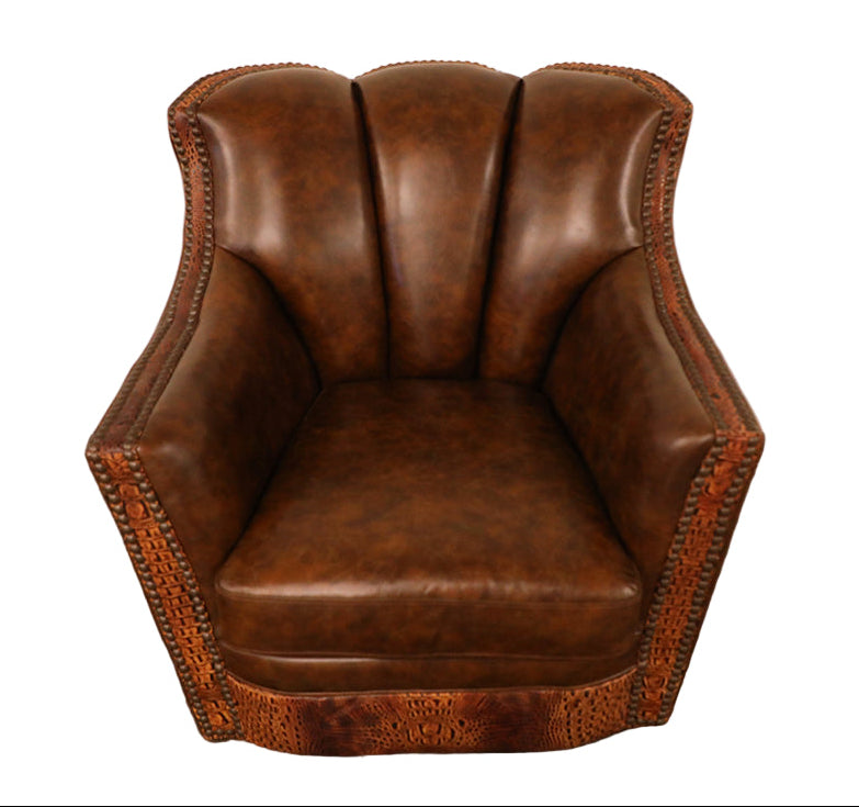 The Heritage Ranch Mesa Grande Butternut Swivel Glider is built for anyone who appreciates true western craftsmanship. Wrapped in a smooth, brown leather with a rich, lived-in patina, this chair pairs comfort with unmistakable character. The sculpted channel-back design offers generous support, while the full swivel-glider base gives it an easy, relaxed motion that fits just as well in a ranch great room as it does in a cozy reading corner.