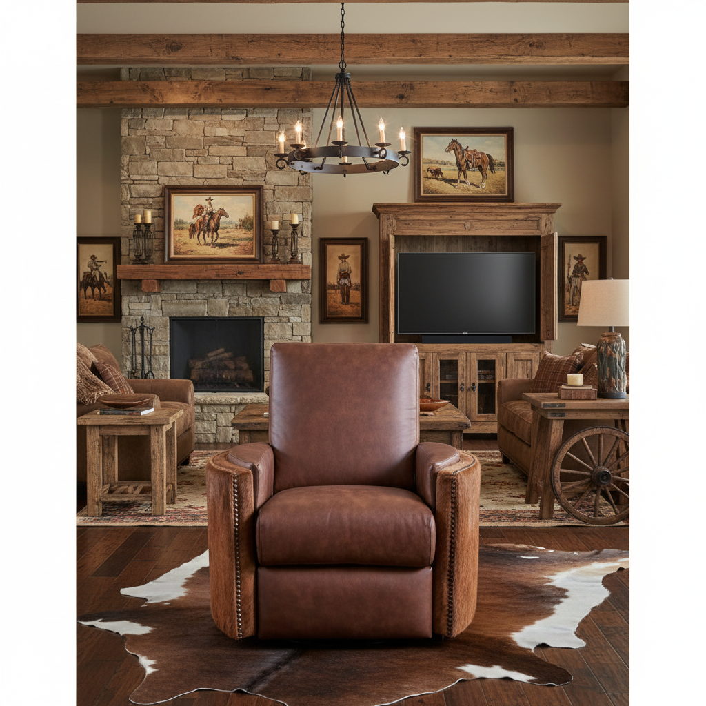 The Heritage Ranch Saddlehorn Brown Leather and Cowhide Recliner offers a clean, understated take on Western comfort. Upholstered in rich brown leather on the seat, inside back, and cushions, this recliner delivers a warm, broken-in feel designed for everyday relaxation. Solid brown hair-on-hide wraps the sides and back of the chair, adding subtle texture and natural character without overpowering the design.